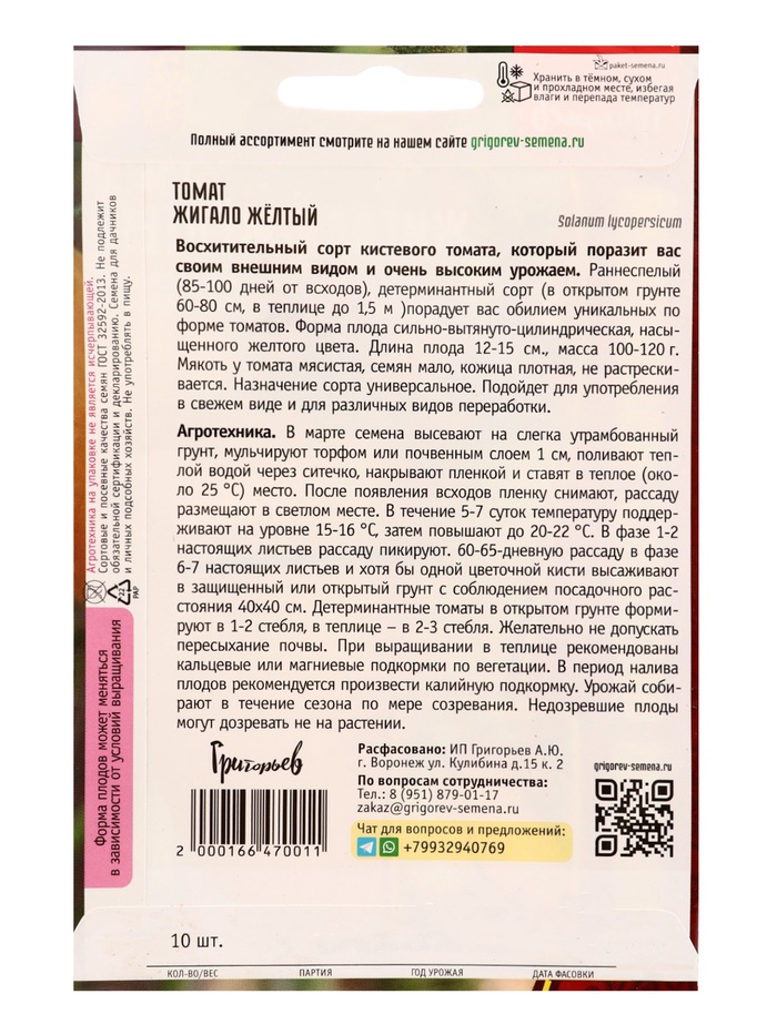Технические характеристики Семена Томат Жигало Желтый 10 шт. 12.29 г.