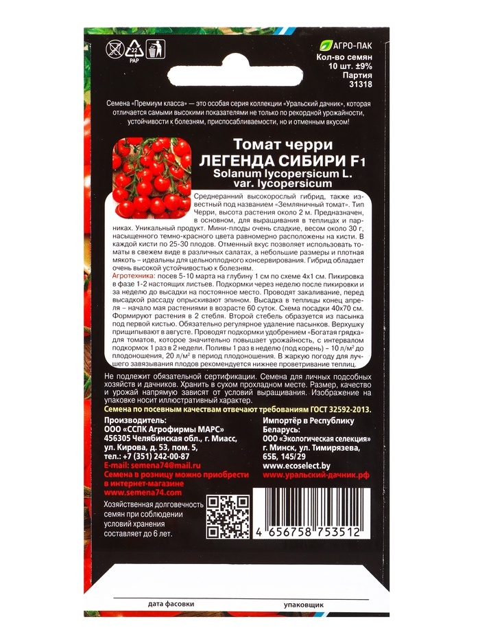 | Материалы из которых произведен товарСемена | Минимальная партия2 | Объем бокса12.464 |