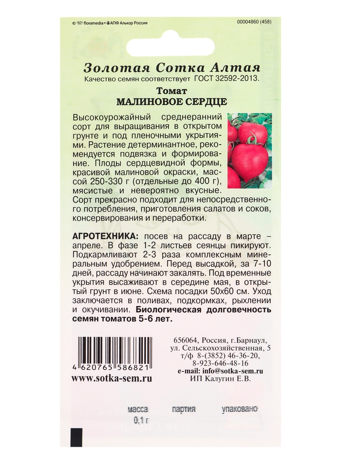 Семена Томат «Малиновое Сердце», 0.1 г, среднеранний, детерминантный, «Золотая Сотка Алтая»