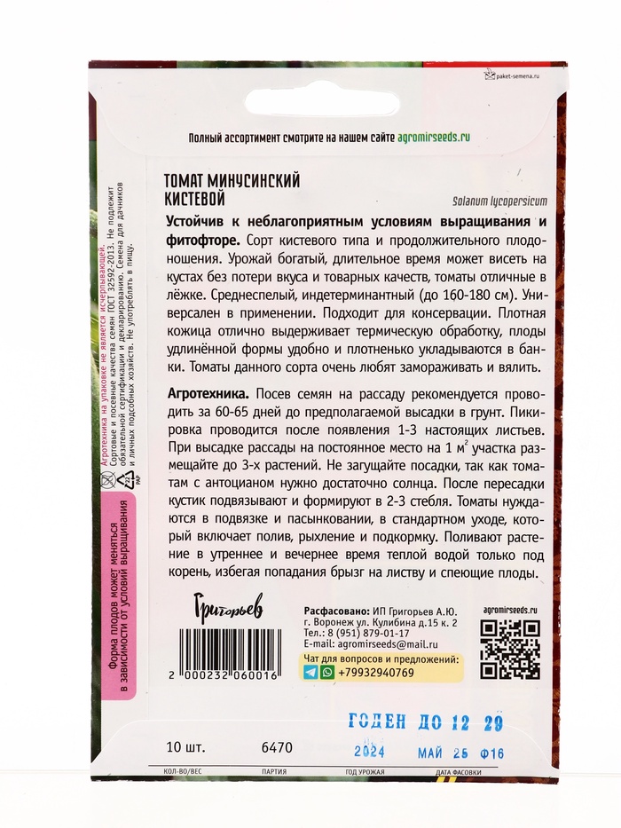 Технические характеристики Семена Томат Минусинский Кистевой 10шт. 12.29 г.