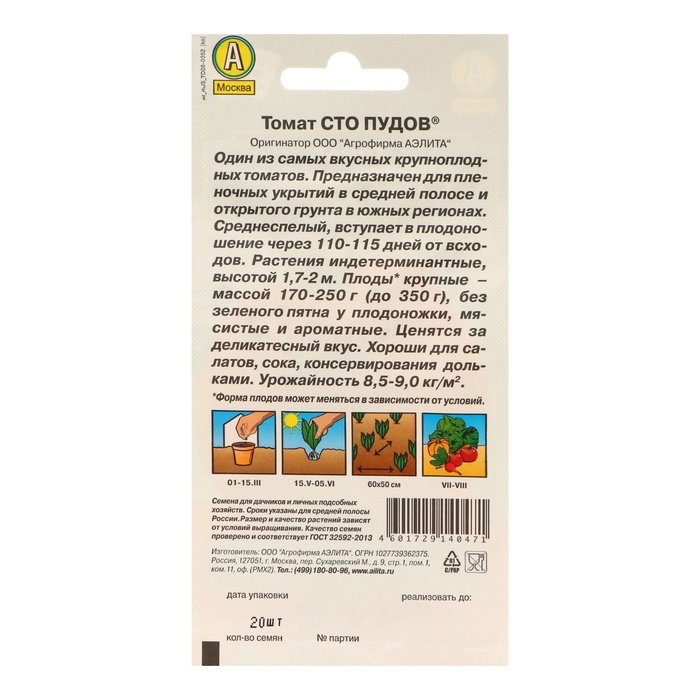 Технические характеристики Семена Томат "Сто пудов", набор 5 шт