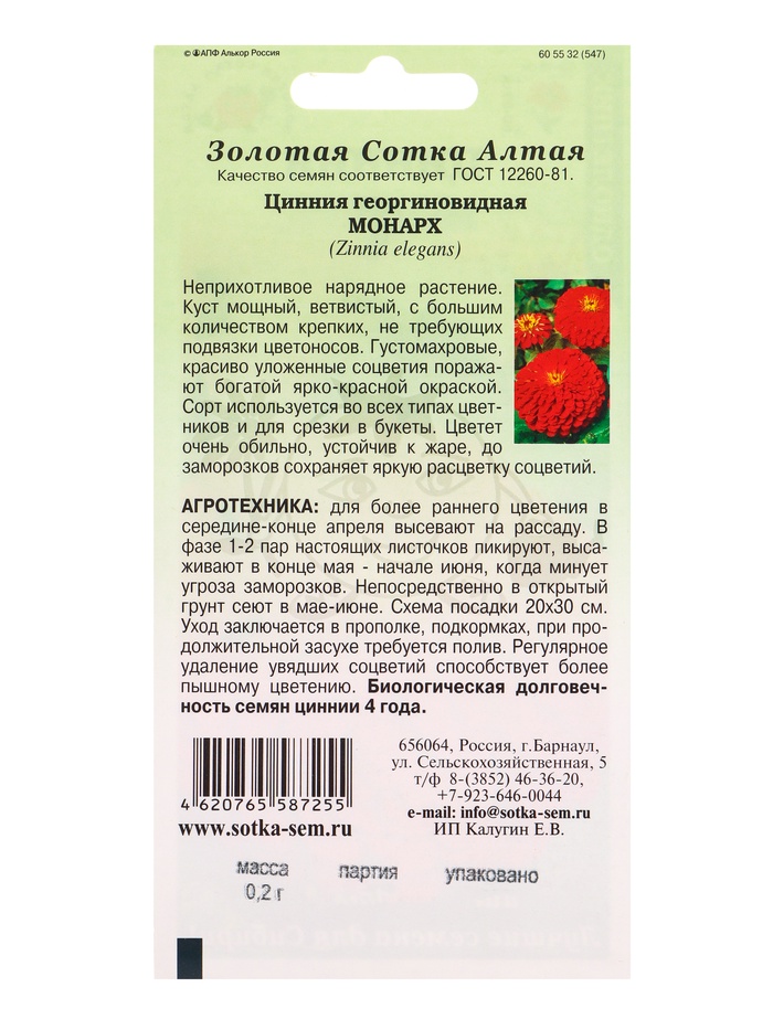 Семена Цинния «Монарх», 0.2 г, красная, «Золотая Сотка Алтая»