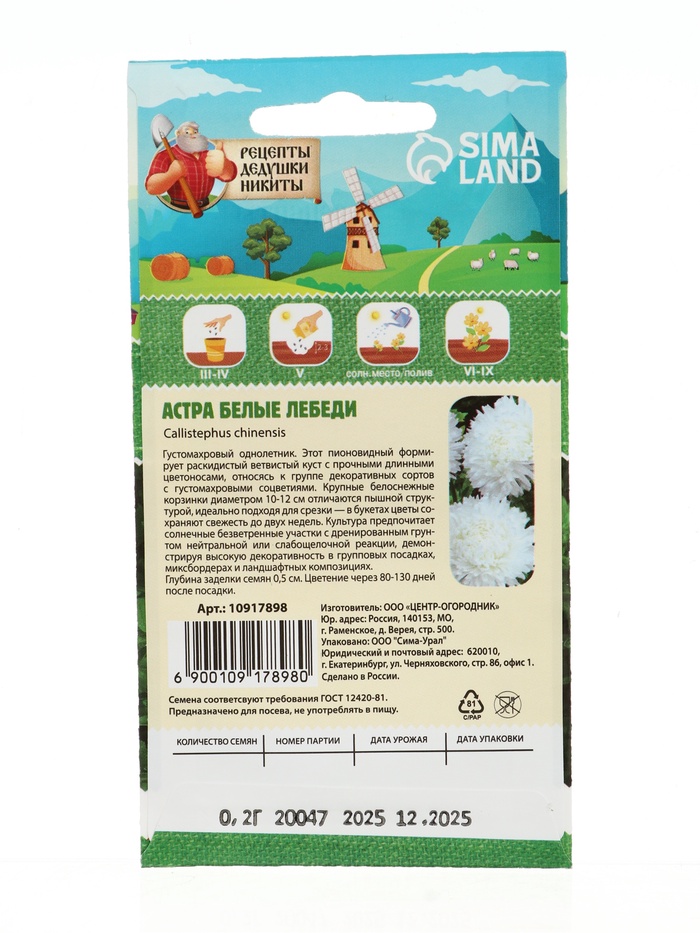 Технические характеристики Семена цветов Астра "Белые лебеди "0.2 г