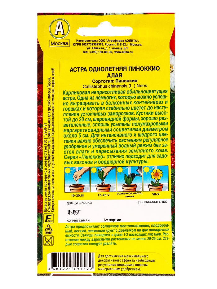 Семена цветов Астра Пиноккио алая Цветущий балкон, Ц/П,0,05 г