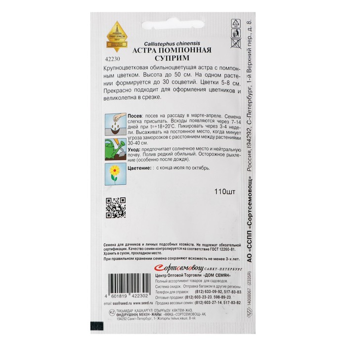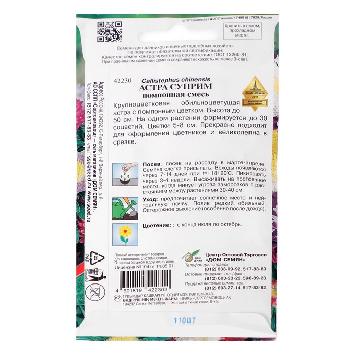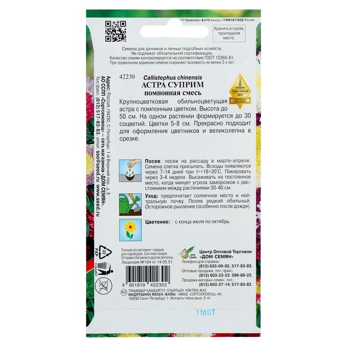 Технические характеристики Семена цветов Астра "Суприм смесь" 110 шт