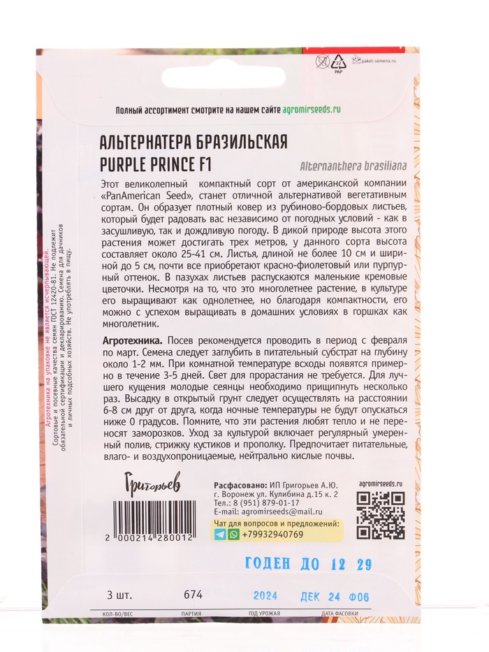 Технические характеристики Семена цветов Альтернатера Purple Prince F1 бразильская 3шт. 12.29 г.