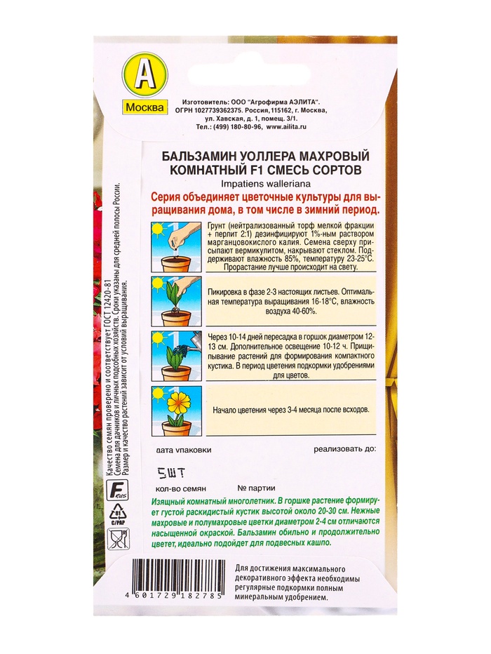 Технические характеристики Семена цветов Бальзамин Махровый комнатный F1, смесь сортов Зимний сад, Ц/П,5 шт.