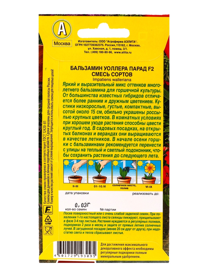 Технические характеристики Семена цветов Бальзамин Парад F2, смесь сортов Цветущий балкон, Ц/П,0,03 г