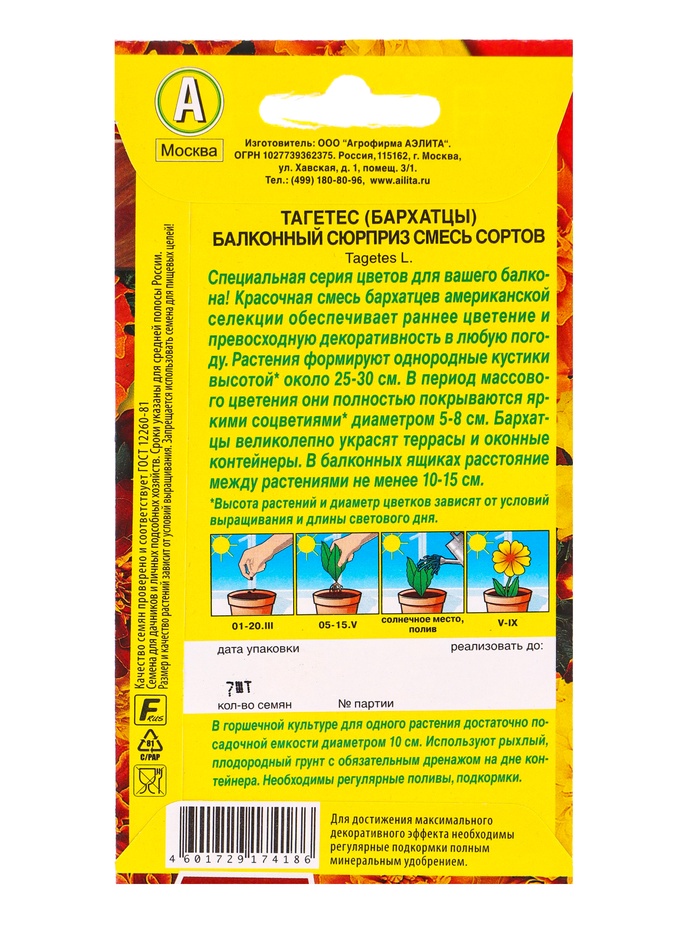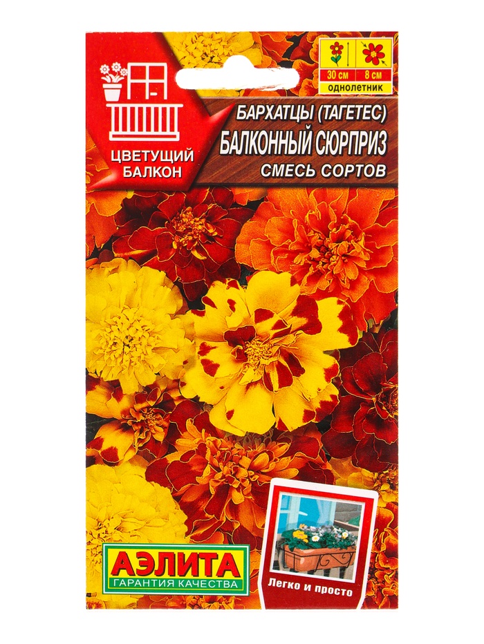 Технические характеристики Семена цветов Бархатцы Балконный сюрприз, смесь сортов Цветущий балкон, Ц/П,7 шт.