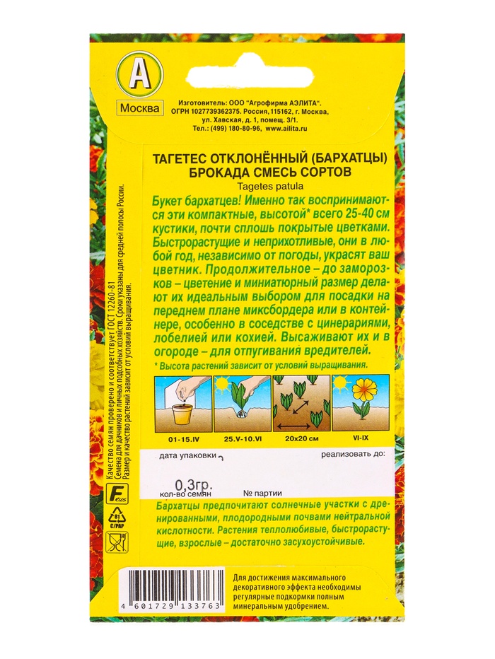 Семена цветов Бархатцы Брокада отклоненные, смесь сортов , Ц/П,0,3 г
