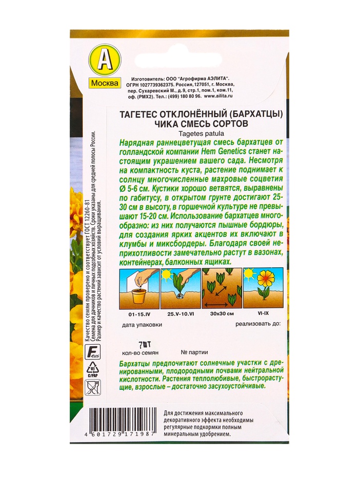 Технические характеристики Семена цветов Бархатцы Чика отклоненные, смесь сортов С. Hem Genetics Золотая серия, Ц/П,7 шт. 1094