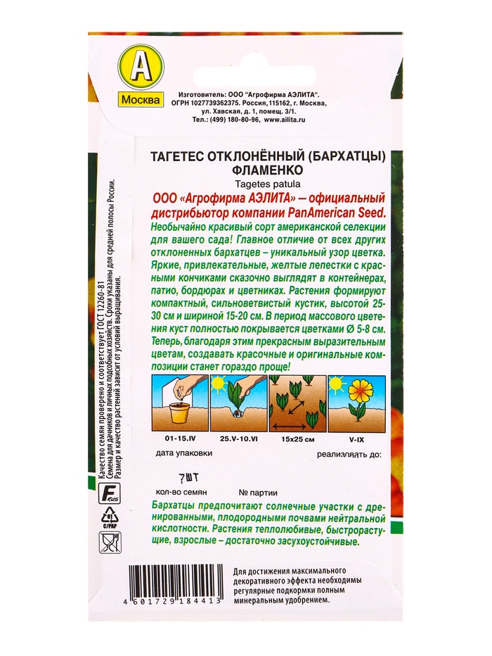 Технические характеристики Семена цветов Бархатцы Фламенко отклоненные Спецсерия PanAmerican, Ц/П,7 шт.