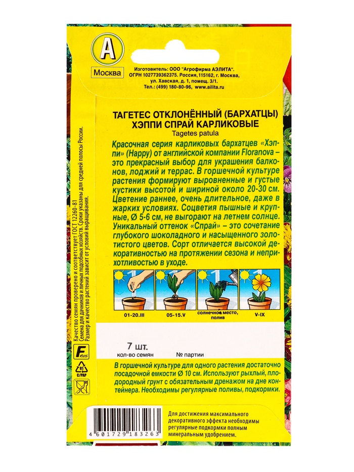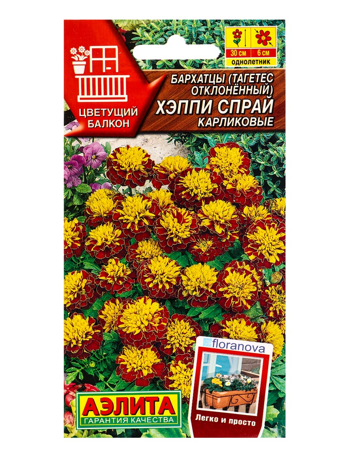 Технические характеристики Семена цветов Бархатцы Хэппи спрай карликовые С. Floranova Цветущий балкон, Ц/П,7 шт.