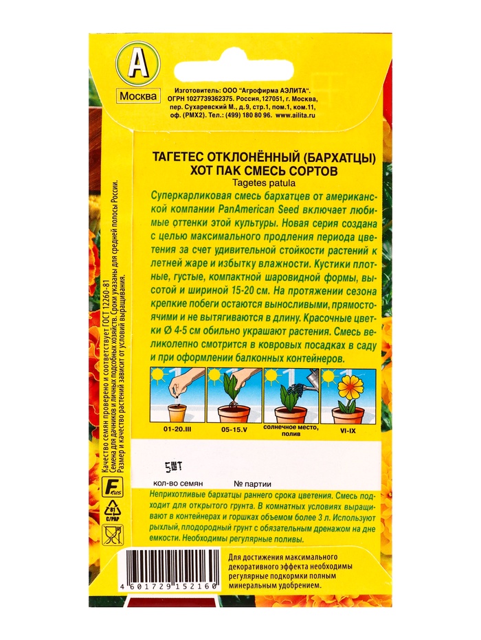 Технические характеристики Семена цветов Бархатцы Хот пак, смесь сортов Цветущий балкон, Ц/П,5 шт.