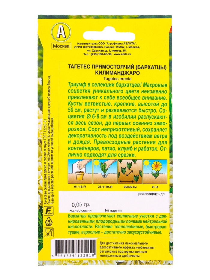 Семена цветов Бархатцы Килиманджаро прямостоячие , Ц/П,0,05 г