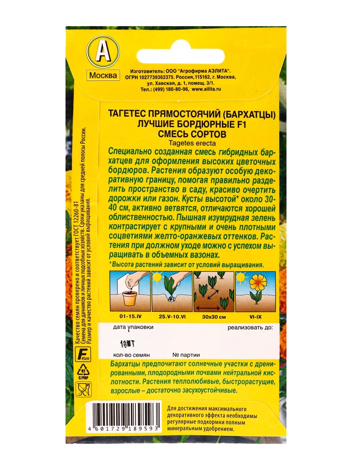 Технические характеристики Семена цветов Бархатцы Лучшие бордюрные F1 прямостоячие, смесь сортов , Ц/П,10 шт.