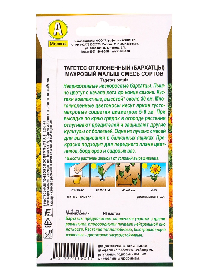 Семена цветов Бархатцы Махровый малыш отклоненные, смесь сортов Золотая серия, Ц/П,0,1 г