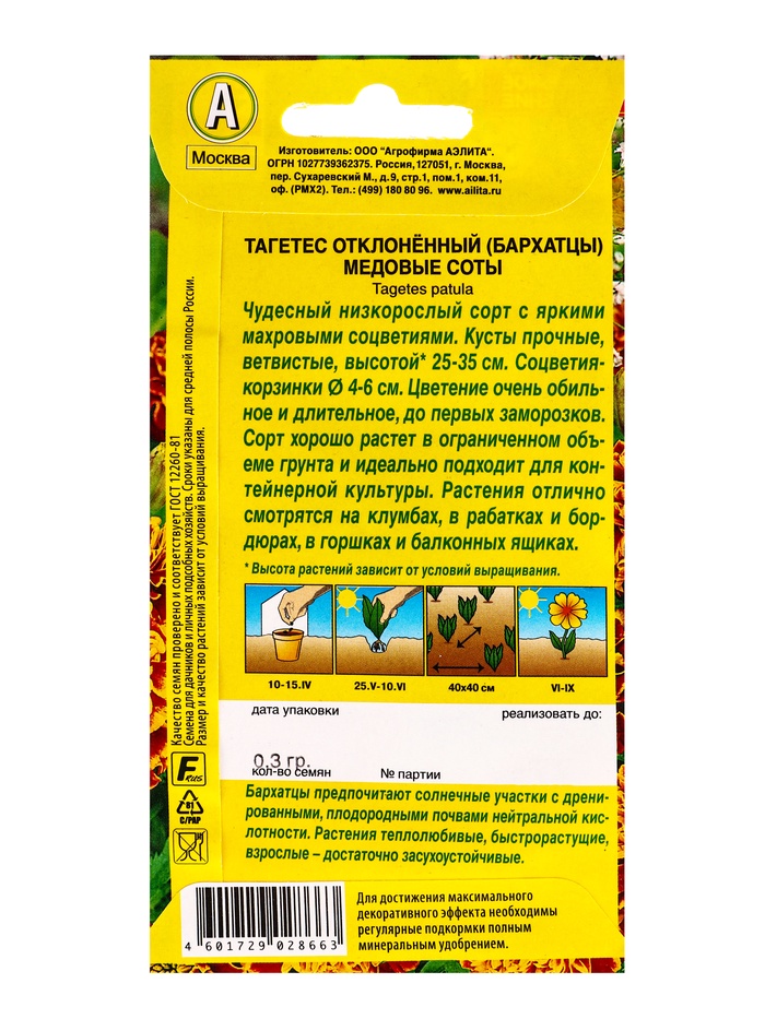 Семена цветов Бархатцы Медовые соты отклоненные , Ц/П,0,3 г