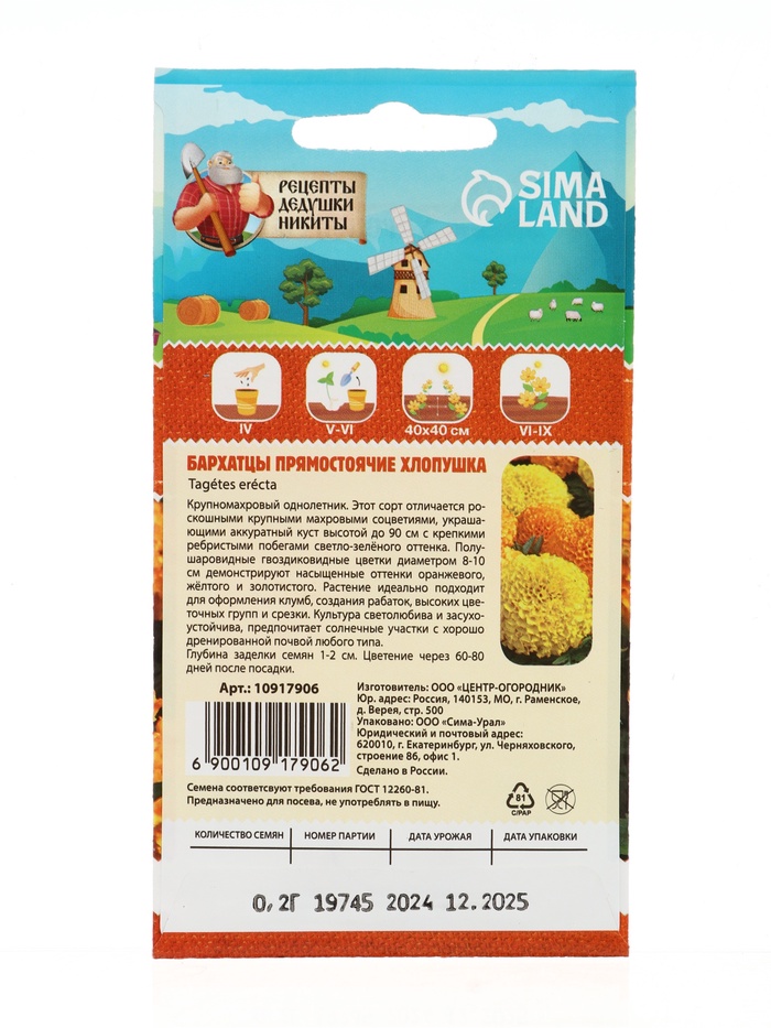 Технические характеристики Семена цветов Бархатцы прямостоячие "Хлопушка", 0,2 г