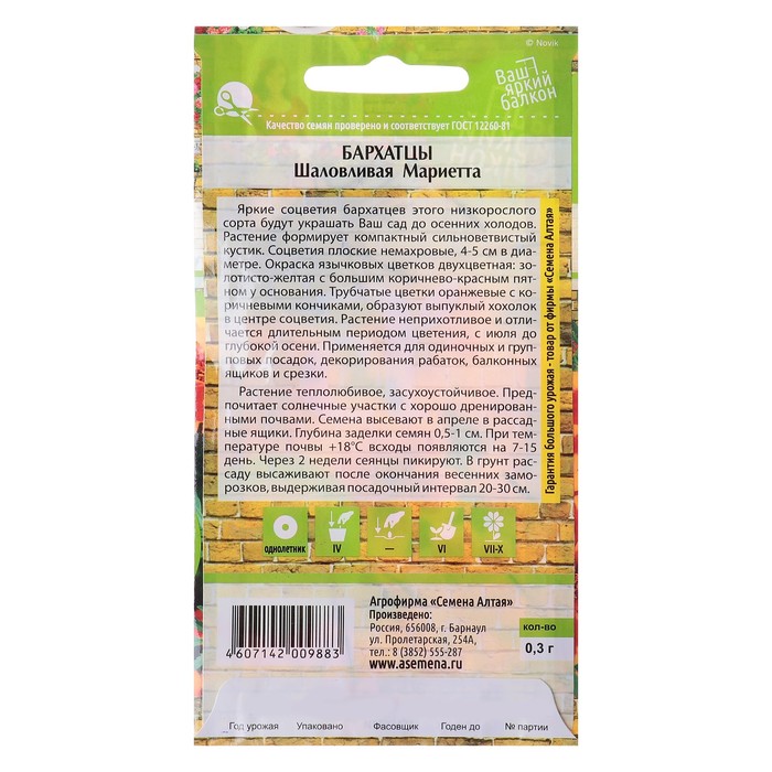 Семена цветов Бархатцы Шаловливая Мариетта, О, цп, 0,3 г продажа, цена в Минске
