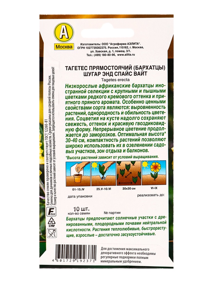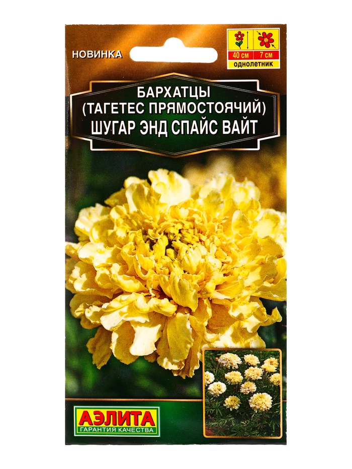 Семена цветов Бархатцы Шугар энд спайс вайт прямостоячие Золотая серия, Ц/П,10 шт.