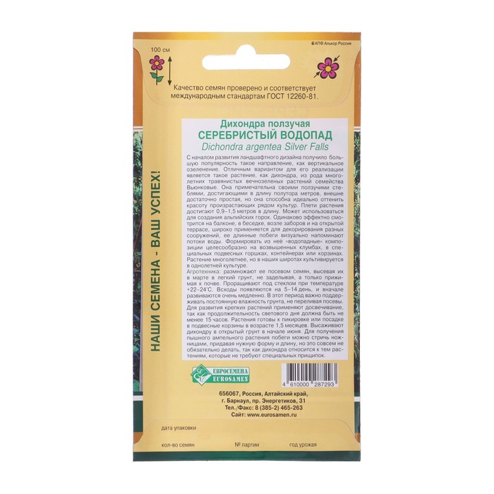 Технические характеристики Семена цветов Дихондра ползучая "СЕРЕБРИСТЫЙ ВОДОПАД" драже, 3 шт
