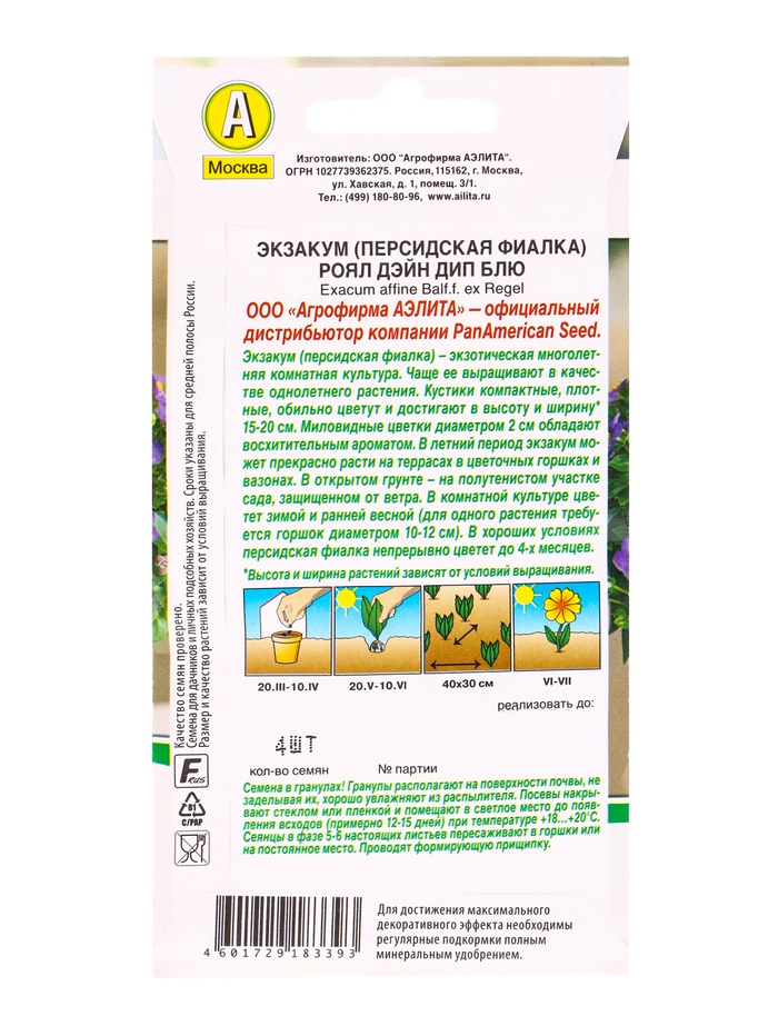 Технические характеристики Семена цветов Экзакум (Персидская фиалка) Роял дэйн дип блю (драже) PanAmerican, Ц/П,4 шт. 1094596