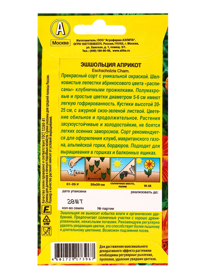 Семена цветов Эшшольция Априкот , Ц/П,20 шт.