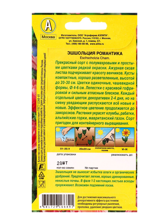 Семена цветов Эшшольция махровая Романтика , Ц/П,20 шт.