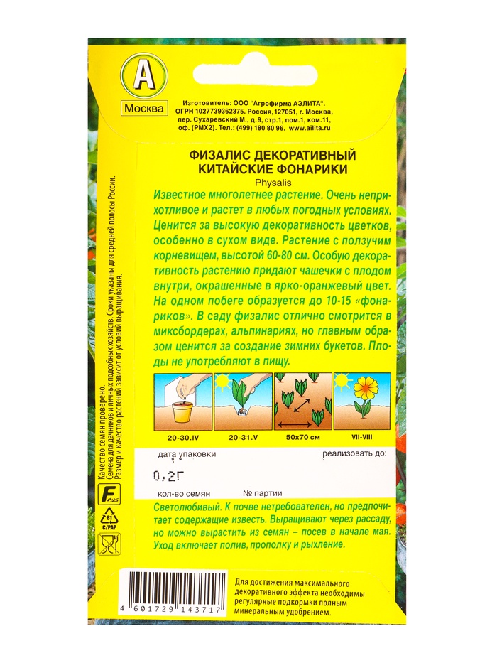 Технические характеристики Семена цветов Физалис Китайские фонарики Мн, Ц/П,0,2 г