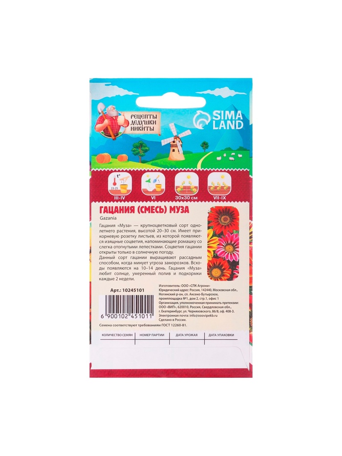 Технические характеристики Семена цветов Гацания «Муза», крупноцветковая, смесь, 0.1 г, «Рецепты дедушки Никиты»