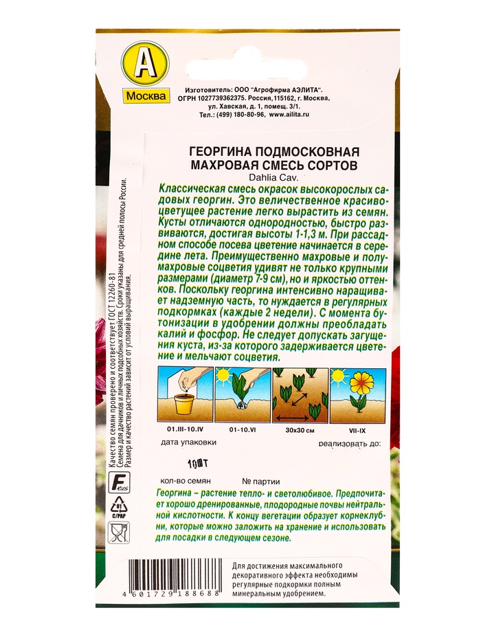 Технические характеристики Семена цветов Георгина Подмосковная махровая, смесь сортов Золотая серия, Ц/П,10 шт.