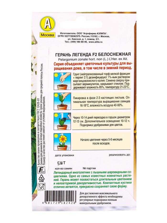 Технические характеристики Семена цветов Герань Легенда F2 белоснежная Мн Зимний сад, Ц/П,5 шт.