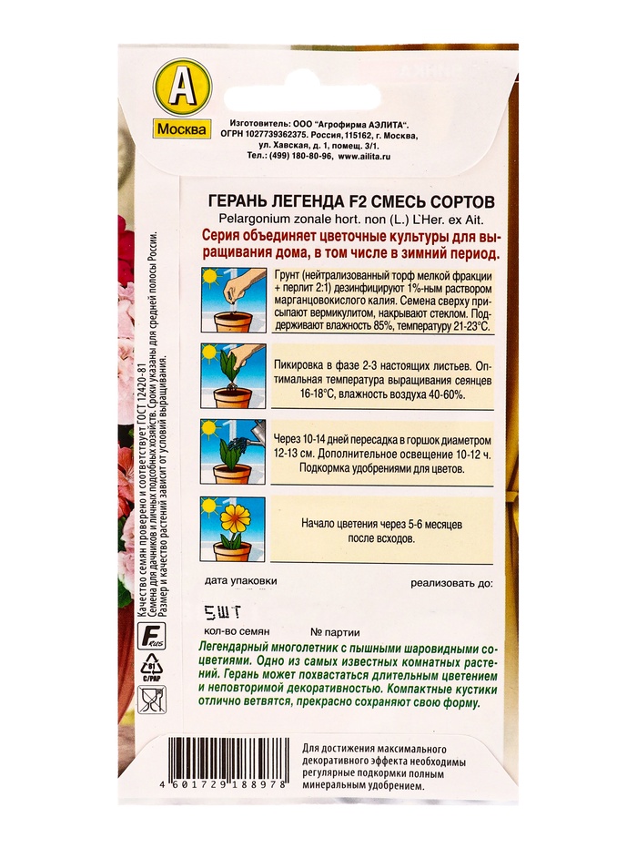 Технические характеристики Семена цветов Герань Легенда F2, смесь сортов Мн Зимний сад, Ц/П,5 шт.