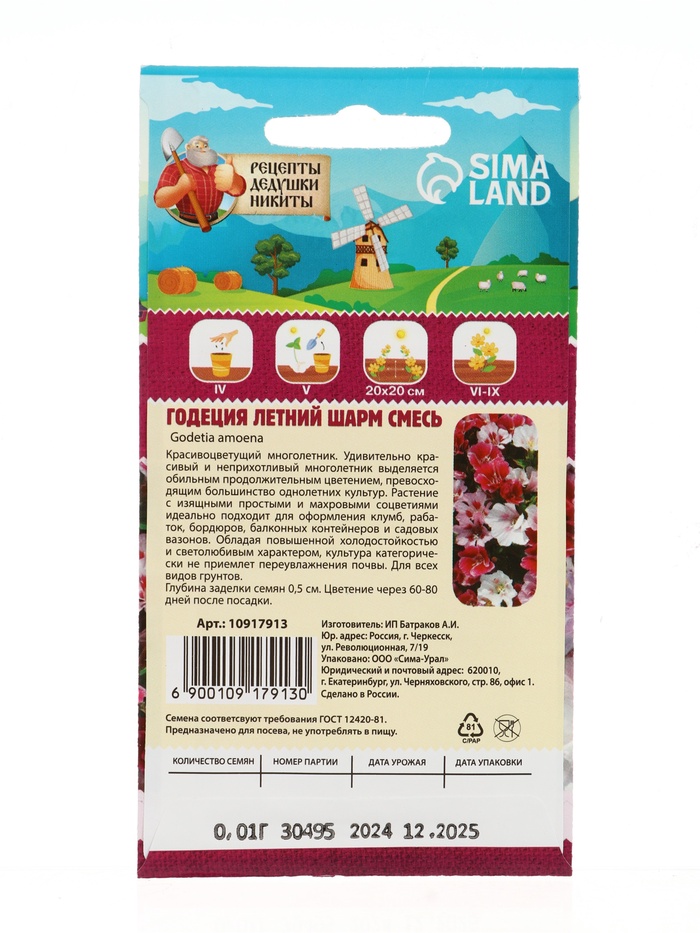 Технические характеристики Семена цветов Годеция «Летний шарм», смесь сортов, 0.01 г