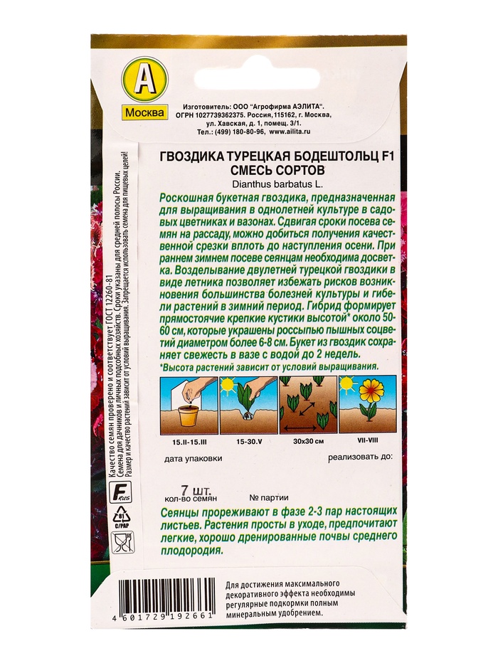 Технические характеристики Семена цветов Гвоздика турецкая Бодештольц F1, смесь сортов Золотая серия, Ц/П,7 шт.