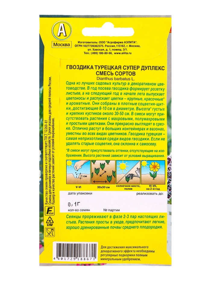 Семена цветов Гвоздика турецкая Супер дуплекс, смесь сортов Дв, Ц/П,0,1 г