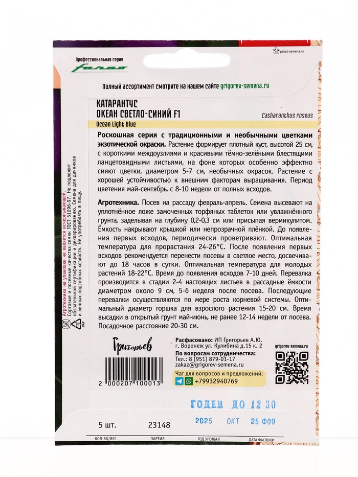 Технические характеристики Семена цветов Катарантус Океан Light Blue розовидный 5 шт. 12.29 г.