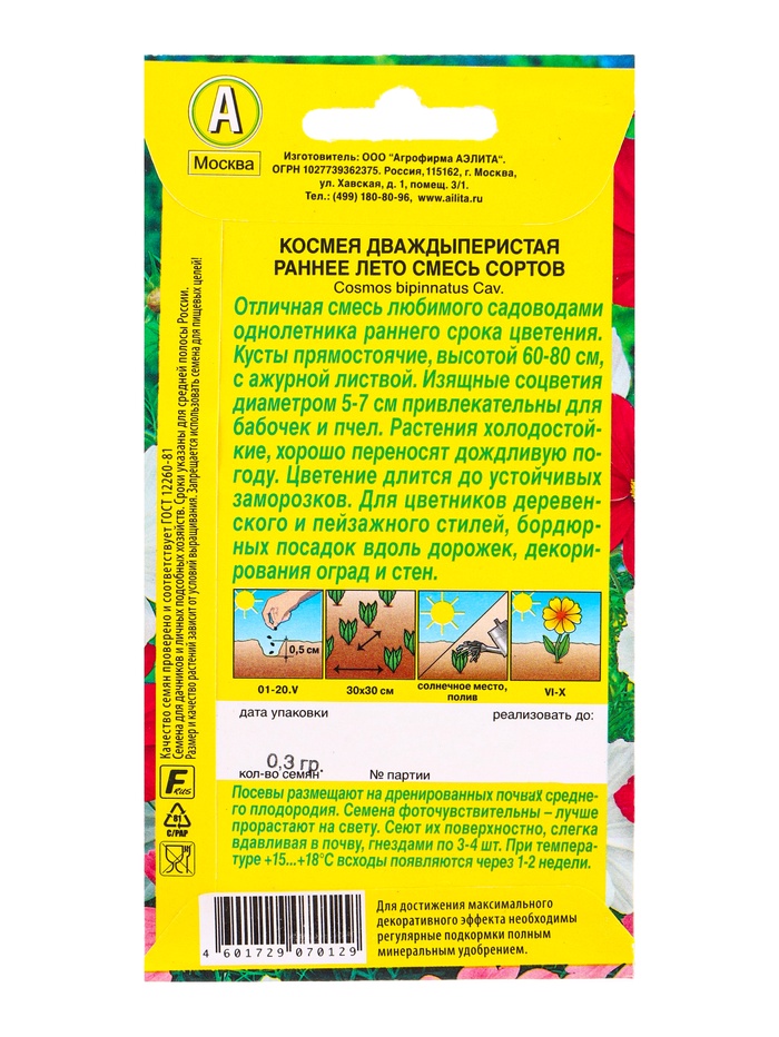 Семена цветов Космея Раннее лето, смесь сортов , Ц/П,0,3 г