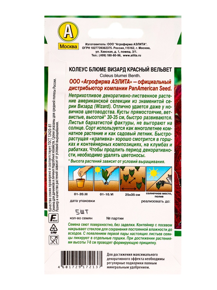 Технические характеристики Семена цветов Колеус блюме Красный вельвет Мн Спецсерия PanAmerican, Ц/П,5 шт.