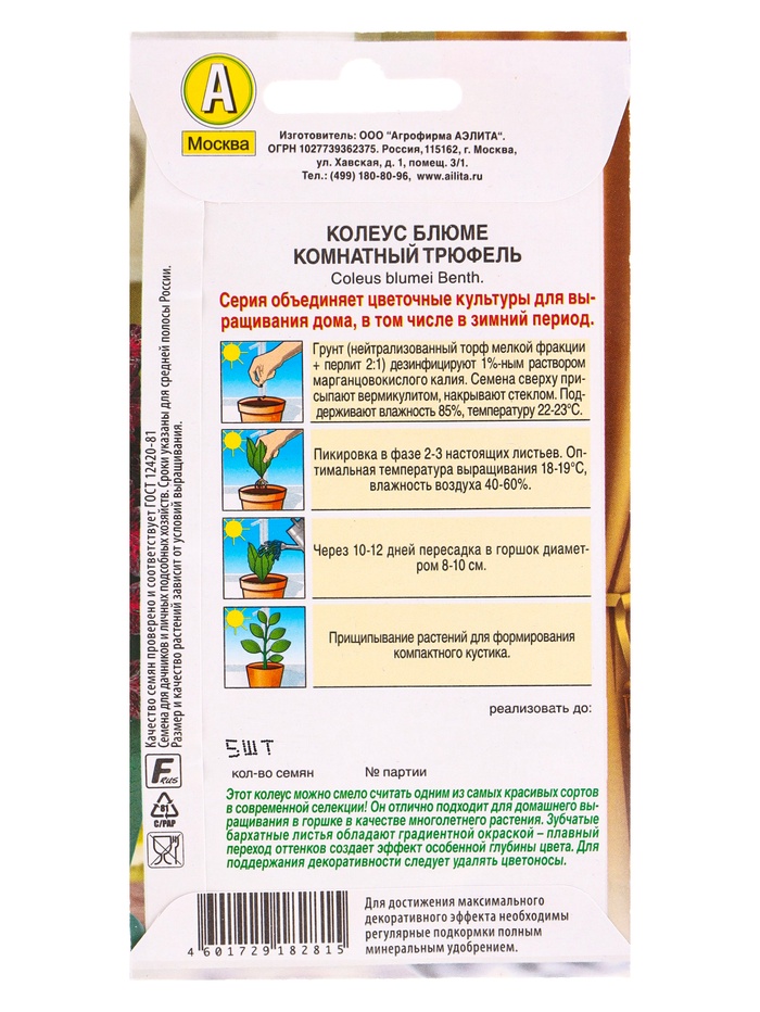 Технические характеристики Семена цветов Колеус Комнатный трюфель Мн Зимний сад, Ц/П,5 шт.