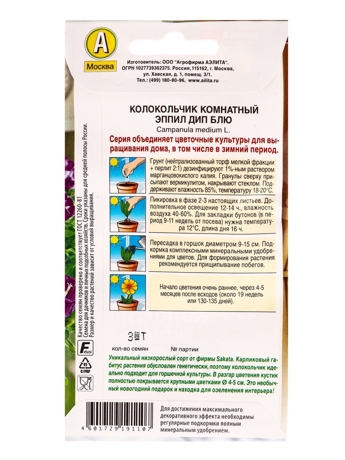 Технические характеристики Семена цветов Колокольчик комнатный Эппил дип блю (драже) С. Sakata Зимний сад, Ц/П,3 шт.