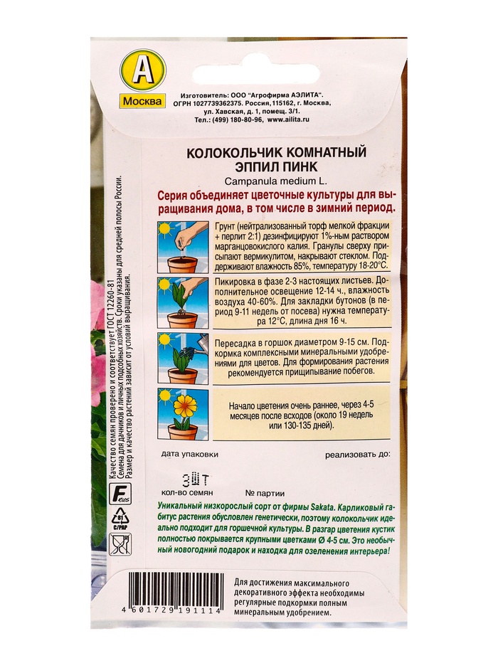 Технические характеристики Семена цветов Колокольчик комнатный Эппил пинк (драже) С. Sakata Зимний сад, Ц/П,3 шт.