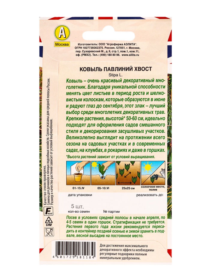 Технические характеристики Семена цветов Ковыль Павлиний хвост Мн Британская коллекция цветов, Ц/П,5 шт.