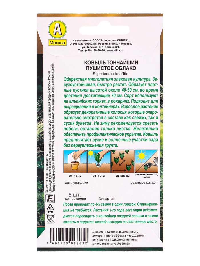 Технические характеристики Семена цветов Ковыль Пушистое облако Мн Золотая серия, Ц/П,5 шт.