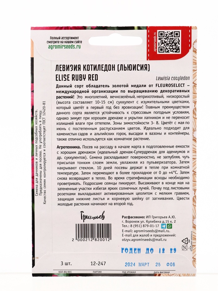 Технические характеристики Семена цветов Левизия Elise Ruby Red котиледон 3шт. 12.29 г.