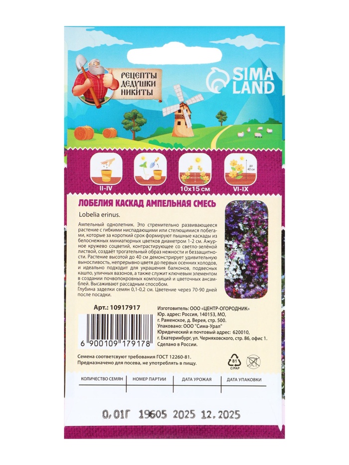Семена цветов Лобелия «Каскад», ампельная, смесь 0.01 г, «Рецепты дедушки Никиты»