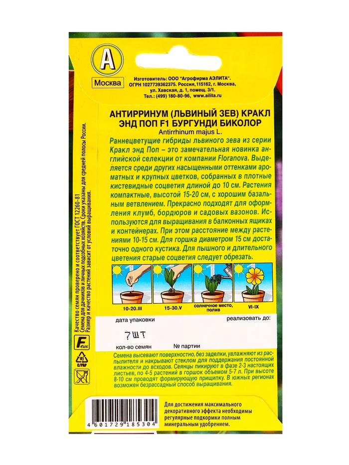 Технические характеристики Семена цветов Львиный зев Кракл энд поп F1 бургунди биколор С. Floranova Цветущий балкон, Ц/П,7 шт.