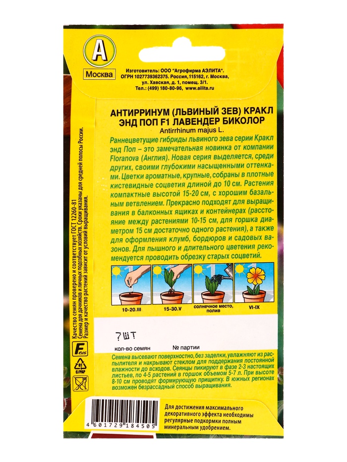 Технические характеристики Семена цветов Львиный зев Кракл энд поп F1 лавендер биколор С. Floranova Цветущий балкон, Ц/П,7 шт.