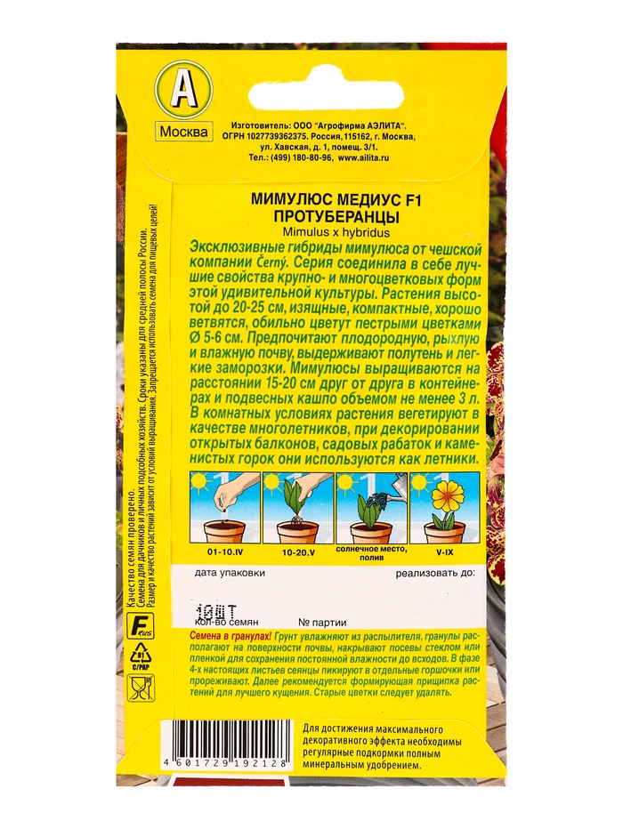Технические характеристики Семена цветов Мимулюс Медиус F1 протуберанцы (драже) С. Cerny Цветущий балкон, Ц/П,10 шт.